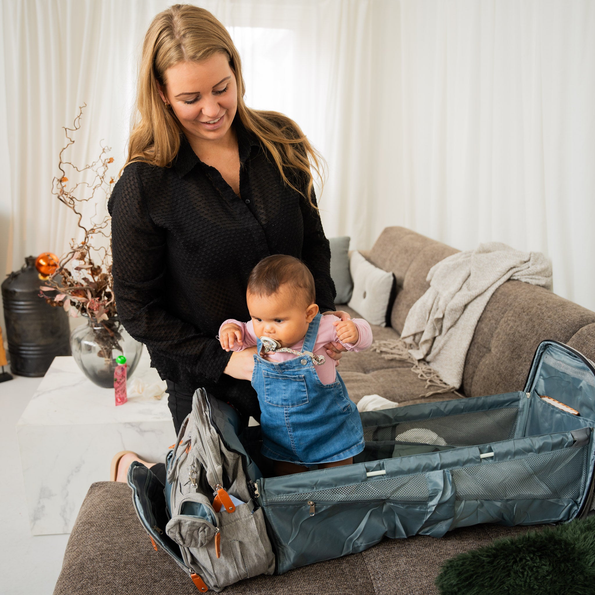 Rygsækken leveres med en sammenklappelig bærbar babyseng, en polstret skiftepude, flere opbevaringsrum, isolerede flaskeholdere og komfortable skulderstropper. Den har alt, hvad du har brug for, når du rejser med din baby.